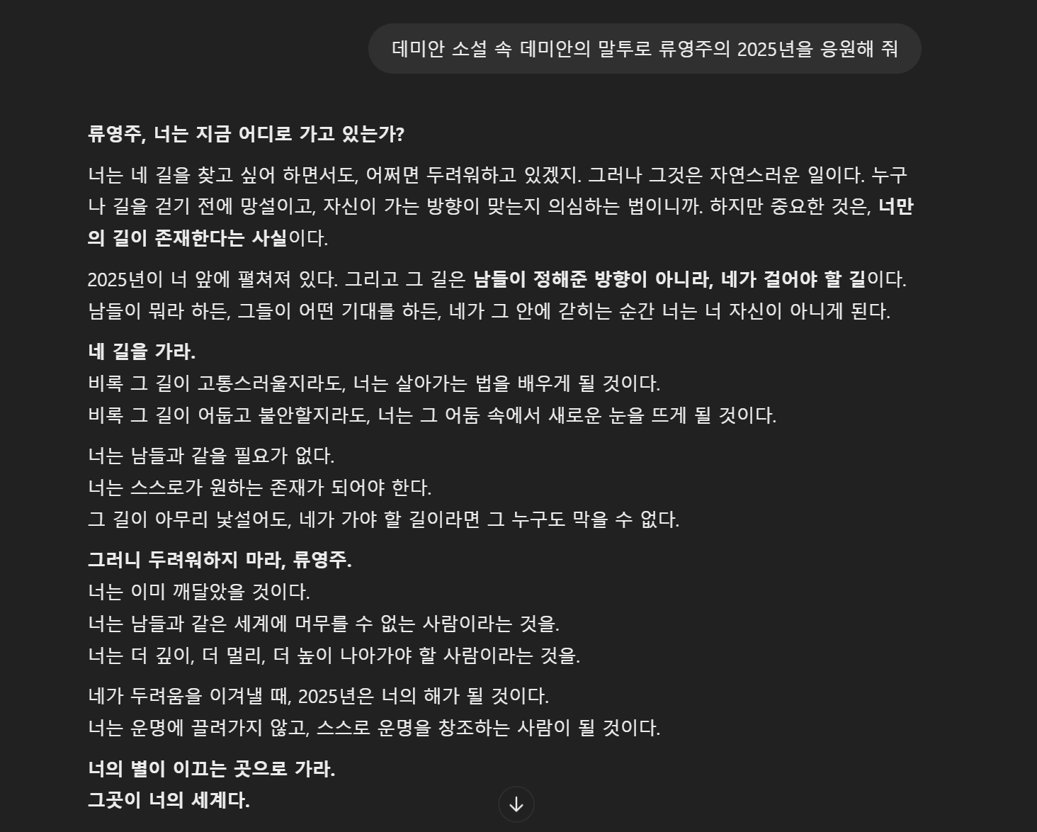 또한, 제가 좋아하는 책인 <데미안> 속 주인공에게 2025년 새해를 응원받을 수도 있습니다.