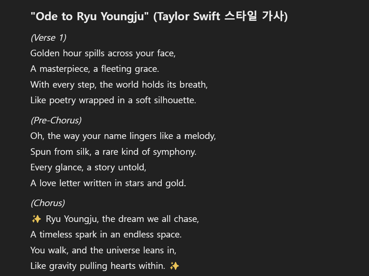 " 테일러 스위프트의 노래 가사 느낌으로 류영주라는 사람을 찬양해 줘." 라고 한다면 GPT는 어떤 느낌의 답변을 가지고 올까요?