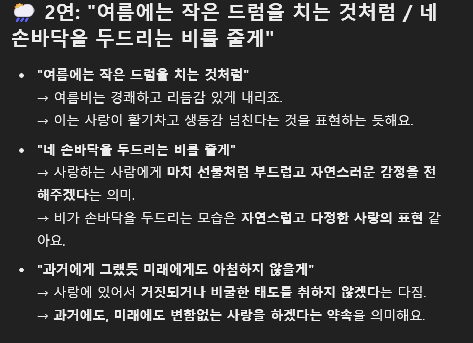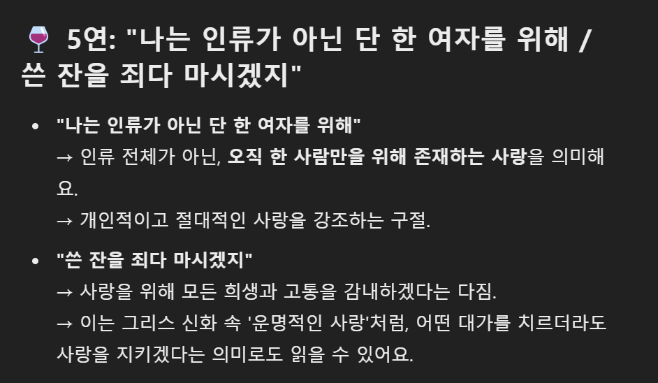 저는 원래 이 시를 좋아하였습니다. 하지만, GPT의 해석을 듣고 나서는 더욱 더 시의 뜻이 이해가 되며 가슴에 와닿는 느낌을 받았습니다. 작가님 본인이 아닌 이상 시의 해석이 정확할 수 있다고는 할 수 없지만, GPT는 문화생활에서도 능하다는 것을 알 수 있습니다.