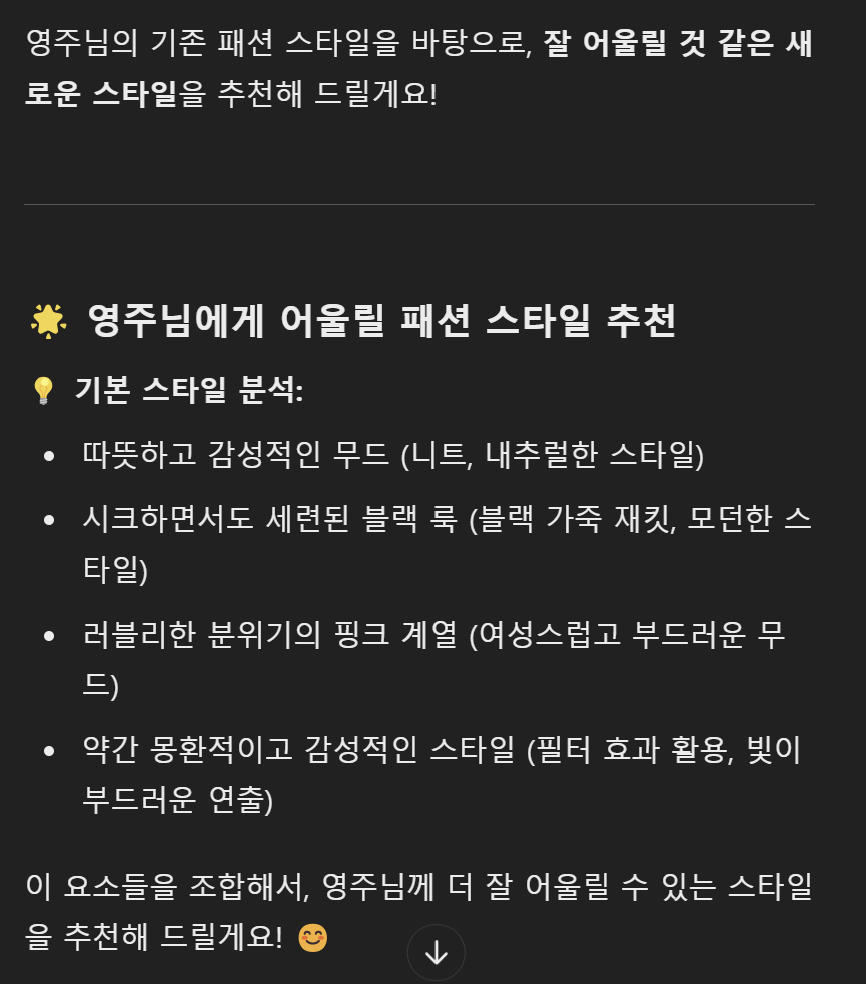또한, 저에게 어떤 패션이 어올릴지에 대해 추천받을 수도 있습니다.